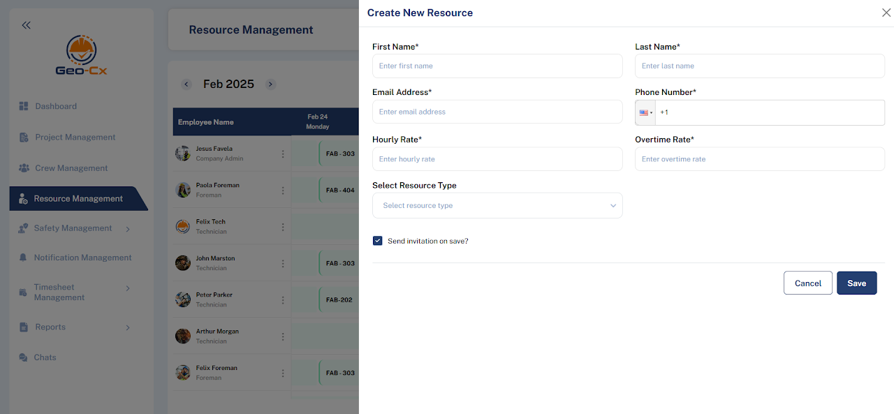 This form is used to input details such as the first name, last name, email address, phone number, hourly rate, and overtime rate. It also includes an option to select the resource type and whether to send an invitation to the new resource upon saving their information.