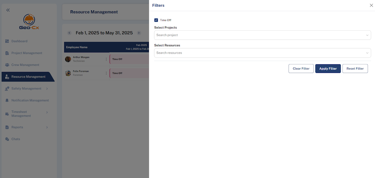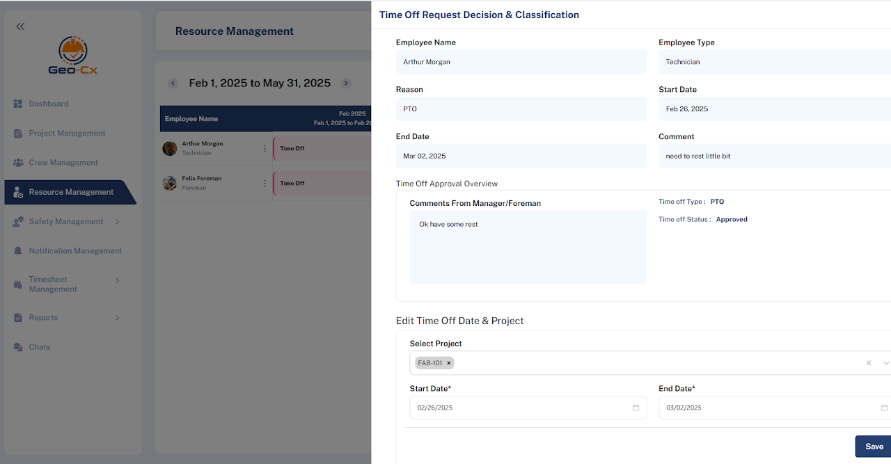 Selecting Resource Type: Choose a role from the dropdown menu (e.g., Foreman, Technician).