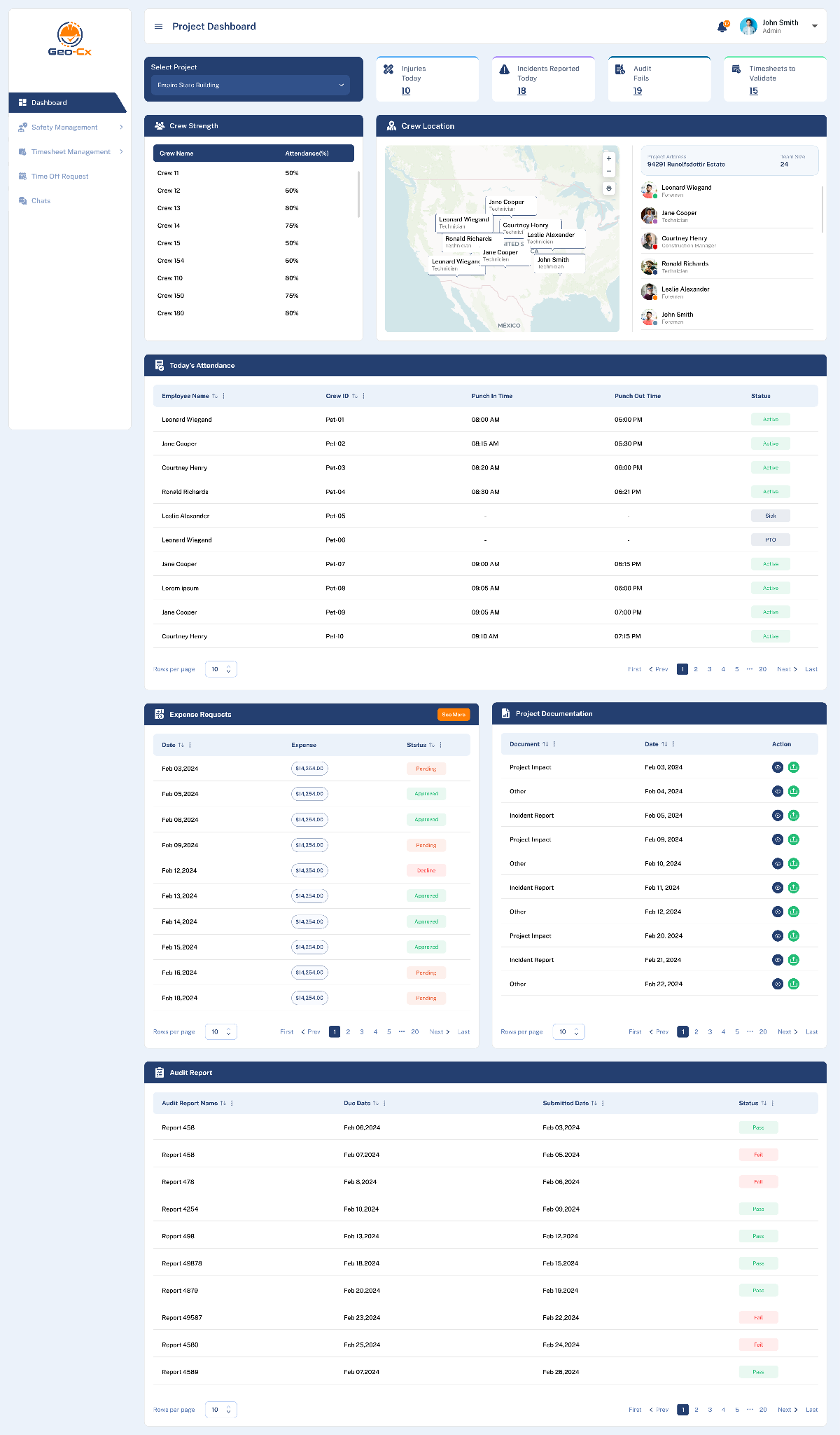 The Project Dashboard on the Geo-Cx platform serves as a vital tool for Company Admin, Construction Manager and Foreman, providing real-time insights and actionable data across multiple project dimensions such as safety, crew management, and financials. This enables effective decision-making and enhances the overall management of the project lifecycle.